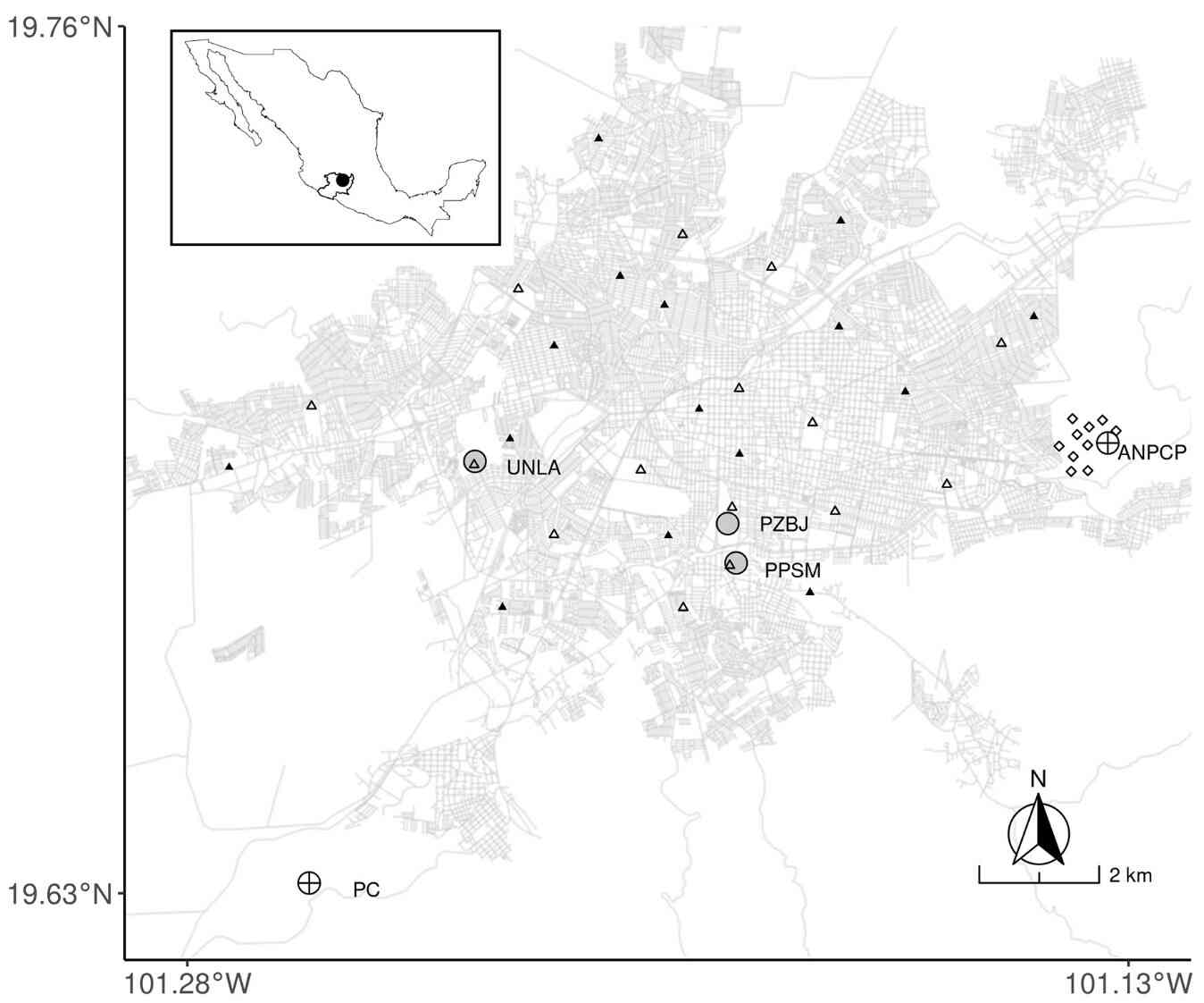 En este proyecto evaluamos si las áreas verdes de Morelia son buenos hábitats de invierno para aves migratorias. Lo iniciamos en 2019 y ha continuado por 3 inviernos. Para el proyecto generamos el primer monitoreo de aves urbanas de invierno del país con el propósito de capturarlas, evaluar su condicón corporal y posteriormente liberarlas. Las estaciones de monitoreo de aves las establecimos en áreas verdes de Morelia, pertenecientes a instituciones gubernamentales y privadas como CONAGUA, Ooapas, el zoólogico Benito Juárez, la Secretaría de Medio Ambiente de Michoacán, y la Universidad Latina de América, con quienes colaboramos y coordinamos para ello (Fig. 1).