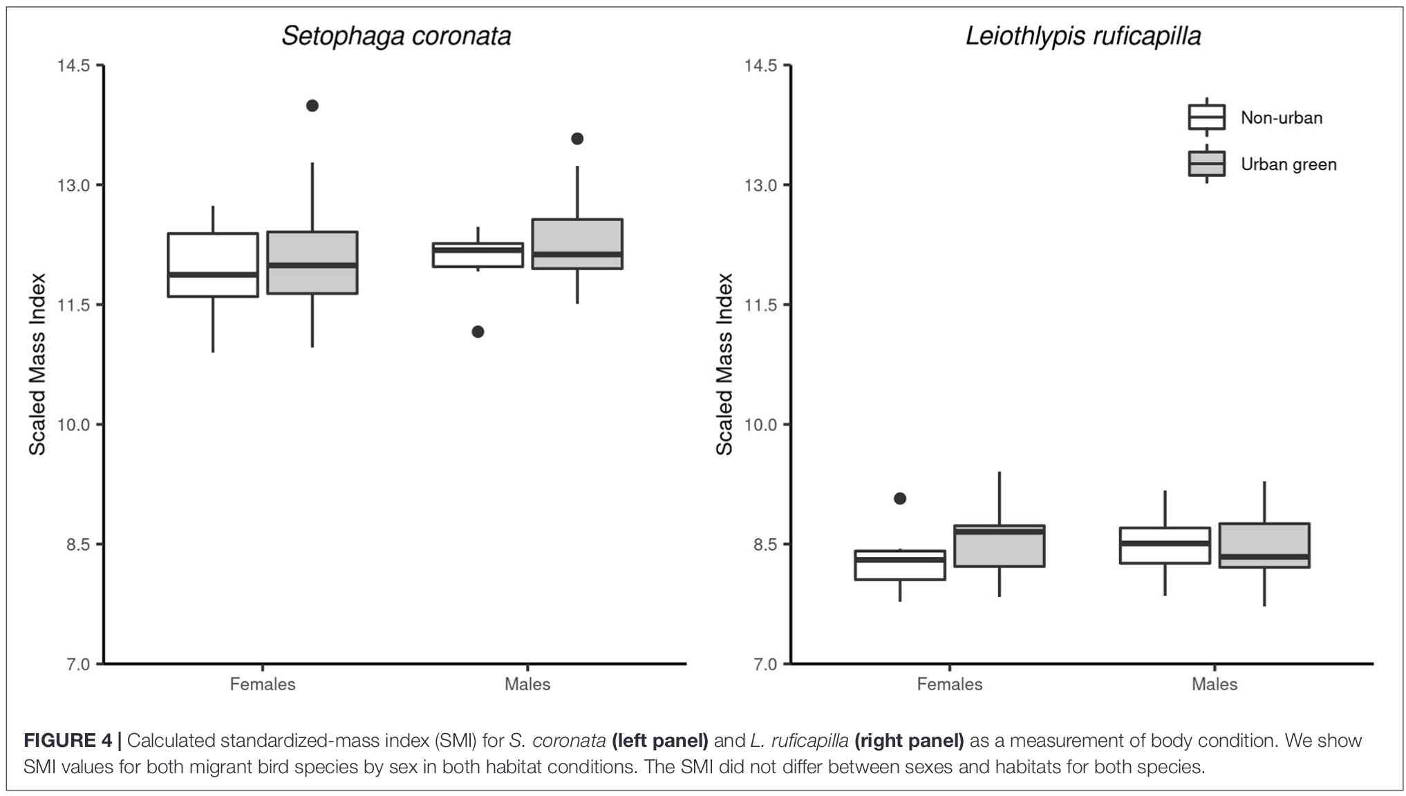 La evaluación de las áreas verdes como hábitat la hicimos utilizando a dos especies de aves como modelo y descubrimos que les son de buena calidad (Fig. 2 y 3). Lo hicimos tras contrastar la condición corporal (índice de masa escalada) de sus poblaciones que viven dentro y fuera de la ciudad (Fig. 4). También caracterizamos las áreas verdes y al compararlas con áreas silvestres notamos que los árboles urbanos son más grandes y complejos. Esto indica que un manejo del ecosistema urbano enfocado a fomentar aves migratorias es factible y positivo tanto para este grupo de aves como para los ciudadanos. Los mismos elementos que fomentan aves migratorias tienen un efecto positivo en la salud de los urbanitas y los procesos de la ciudad, por lo que mi perspectiva plantea un ganar-ganar en el manejo urbano.